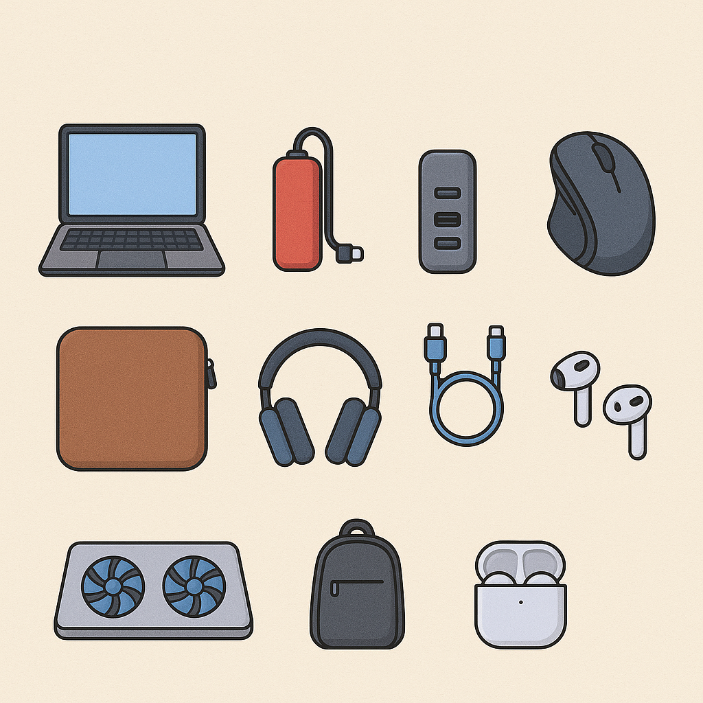 - 필수 액세서리: 외장 SSD, USB 허브, 노트북 거치대, 무선 마우스/키보드, 품질 좋은 파우치